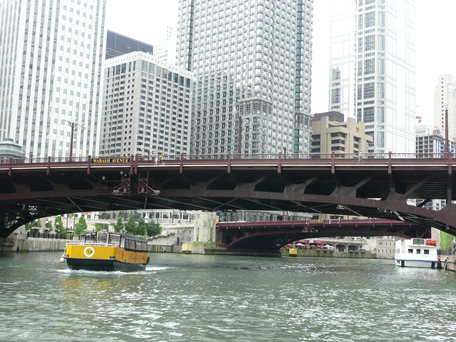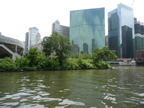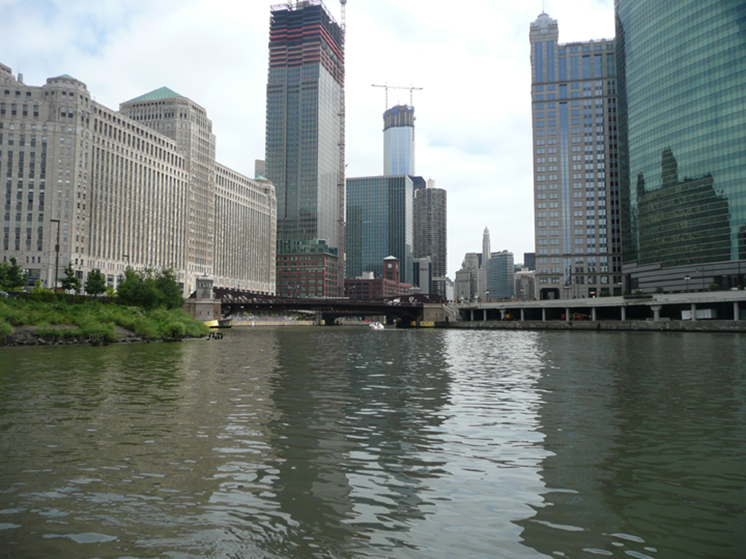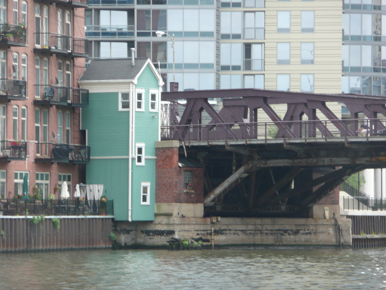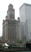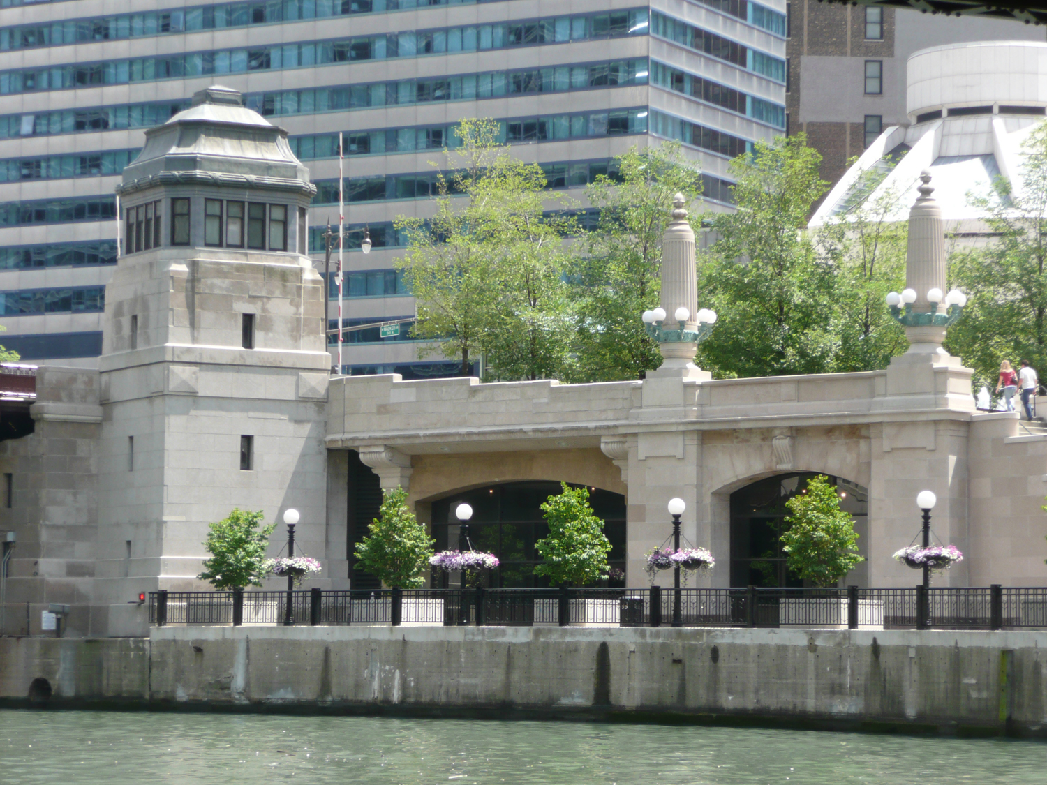 | Chicago River view of downtown skyline. | Reflective building. | Merchandise Mart on the left cost a lot of money and was a bad investment for its builders. | Chicago greenway. | Old bridgehouse. ਠ††
