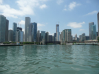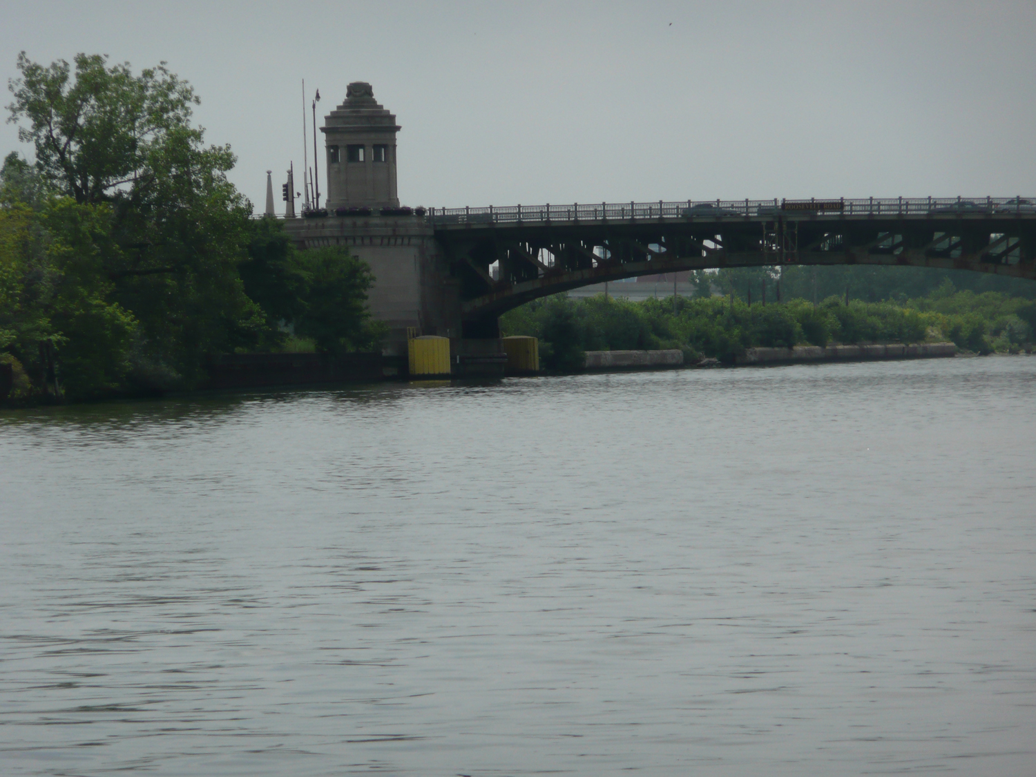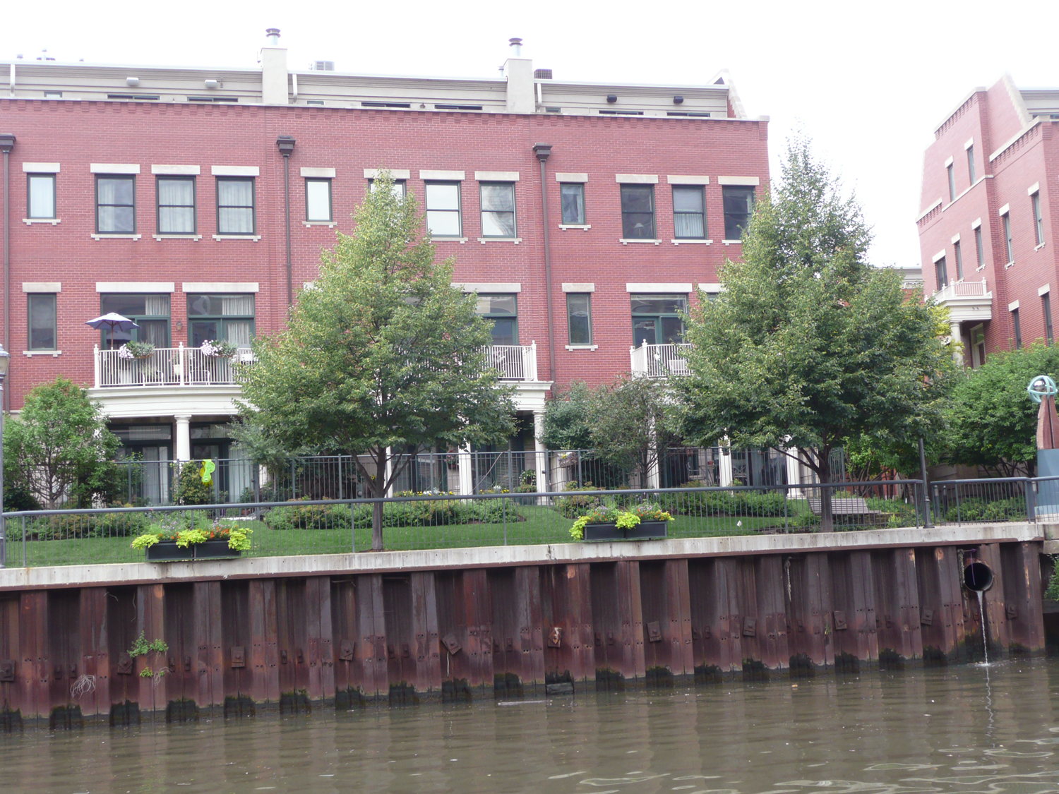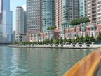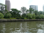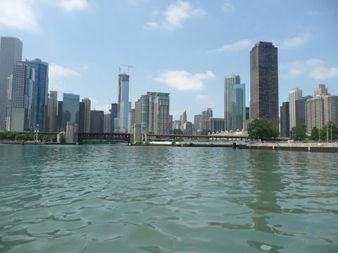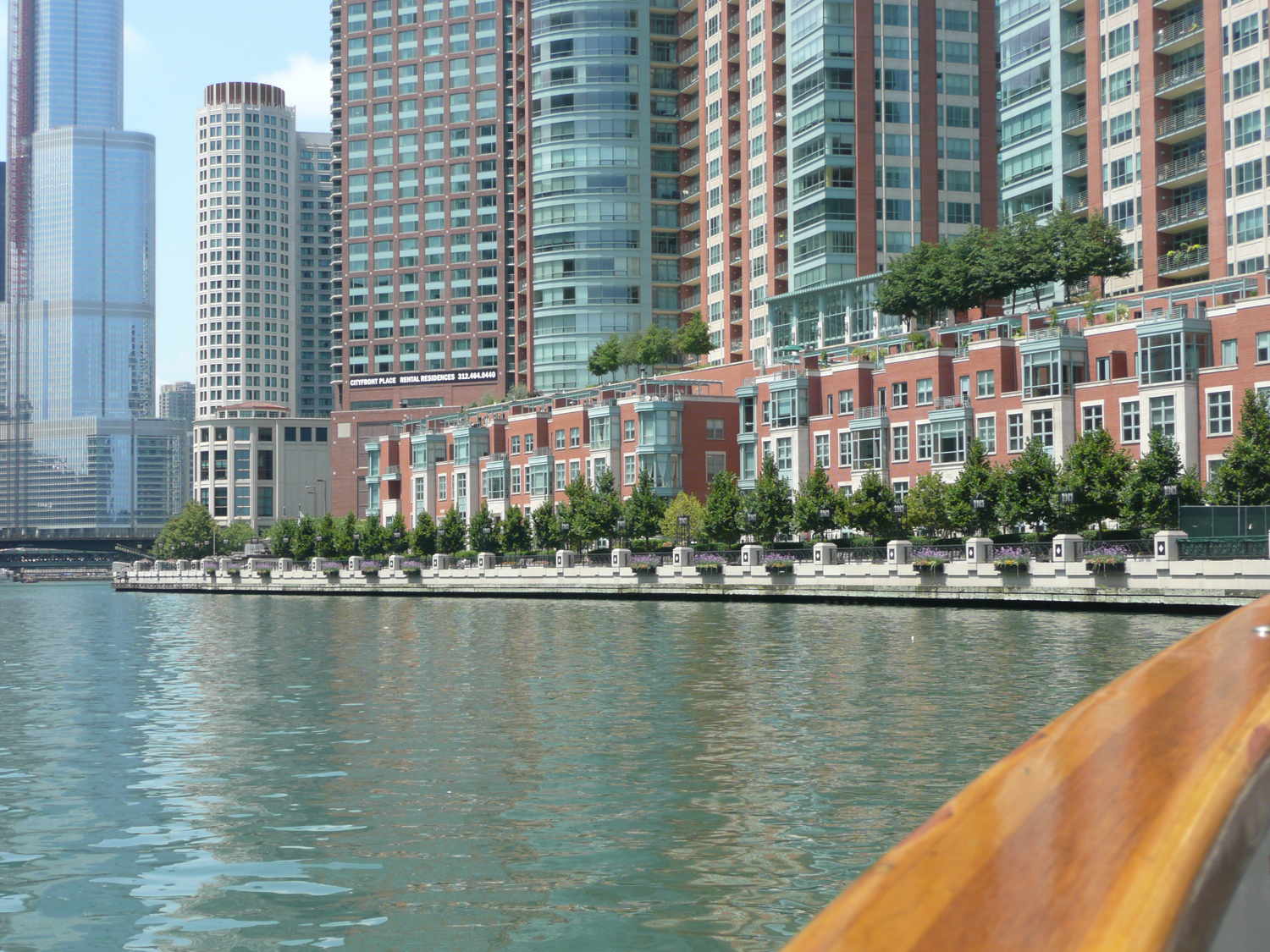 | Bridge house and cafe. | Navy Pier is on the left | Panoramic view of downtown skyline from river mouth. | Continued view of downtown from the mouth of the Chicago River. | Red brick apartments, from boat railing. |
