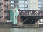 | Boat going under bridge. | Curved lines on buildings represent the style of a famous local architect. | Bridge houses. | Red brick building and cafe. | Tiny blue bridge house. |