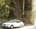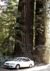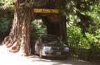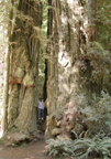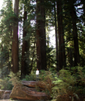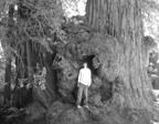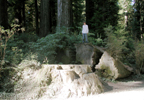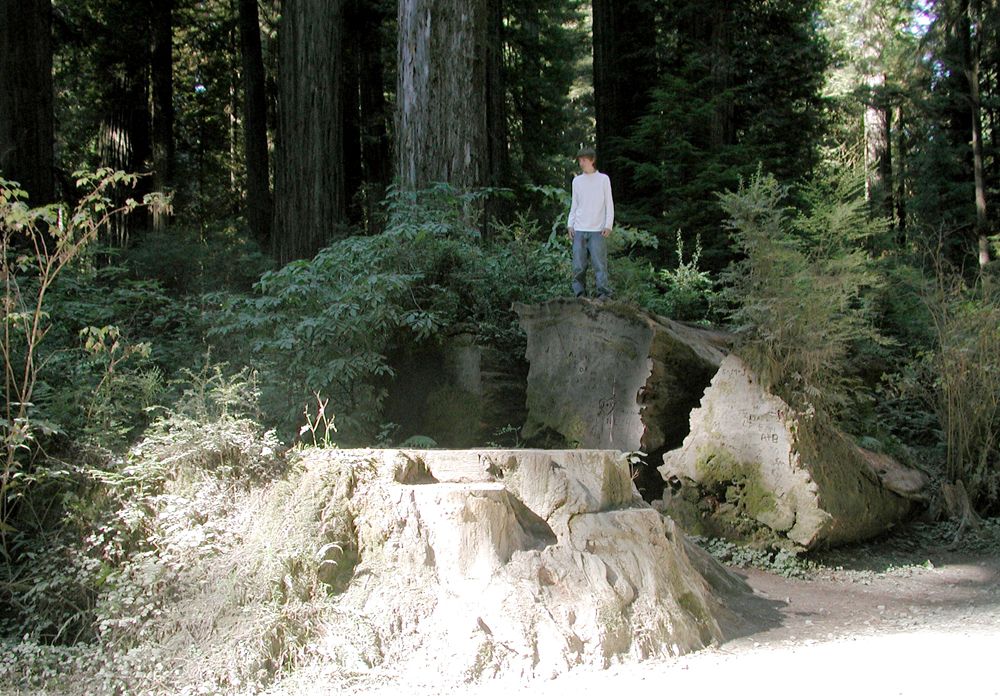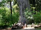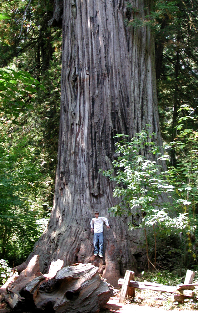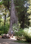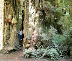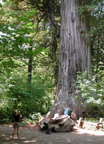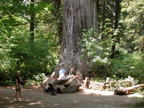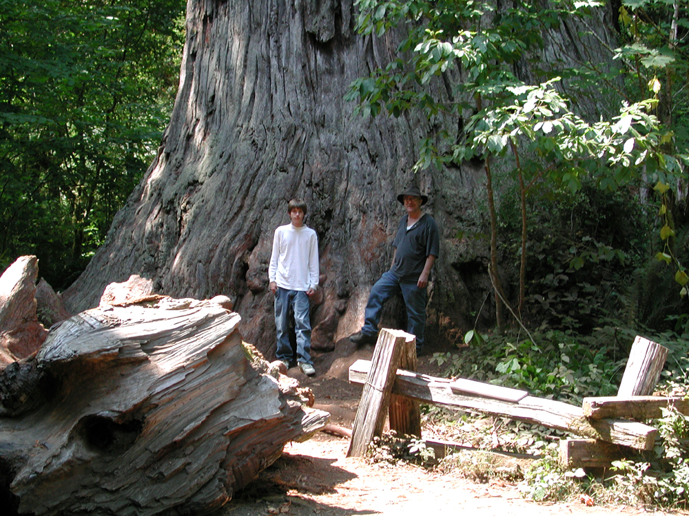 The Big Tree is near Prairie Creek, between the towns of Klamath and Orick. Grandpa Bob has seen several large elk every time he has ever visited for more than 30 years, until this trip. We visited during late morning and the weather was laready hot. Everyone suspected the elk were in the deep shade of the surrounding forest, keeping cool. The herd is also much smaller than in the past, when it was more than 30 animals only a few years ago. A rival bull took some of the cows and calves with him, and we were told a Winnebago killed half the remaining herd. There are only about six elk now, and we didn't see any of them. Then we took the short hike to the Big Tree, which has lost a huge limb or old top since the last visit, crushing a big section of the fence in the process. We think this may be the same tree in an old colorized photograph from the 1930s that Grandma Pam bought in a South Dakota garage sale about 20 years ago. The brush has grown up very thickly around the tree since that time. It would look better if it were maintained with a clear forest floor, as in times past.