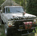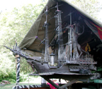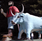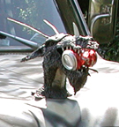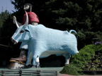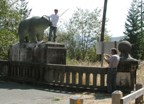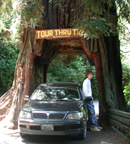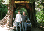 On the trip we met and talked to a number of interesting people, including Paul Bunyan, who converses with people as they enter Trees of Mystery, where they have a wonderful display of museum-quality artifacts of North American Indian people. Kenneth E. Groves, a metal sculptor (dragonfever1@lycos.com) and photographer, invited us to visit his camp and get a brochure of his work. Aaron spotted fresh bear prints in the sand far below the surface of the old Klamath River bridge, and Ken verified he had encountered a sow bear nearby the previous day and thought she probably put them there. On the way back to Oregon later that day, we stopped at a drive-through tree in the town of Klamath and paid $4.00 to drive through and take photos. The last time Grandpa Bob went through it cost $2.50, and the same family has owned the same property since 1895.